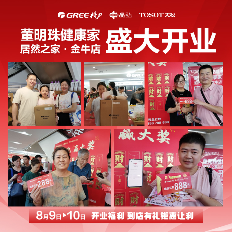 格力董明珠健康家居然金牛店开业:开启健康生活新体验发表时间:2025-08-11 15:28 ![]() 店内全面升级,品类涵盖空调、冰箱、洗衣机、净水、厨电、生活小电等,高端设计让你沉浸式体验智慧家居。 ![]() 开业三重暴击福利 1️⃣ 签到就白嫖:扫码签到领定制灭蚊灯/艾草锤/格仔帆布包 2️⃣ 金蛋砸到嗨:苹果电饭煲、格力转页扇、格力电火锅等100%中奖 3️⃣ 红包雨不停:真金白银,最高888元现金红包,嗨翻全场 ![]() 健康家黑科技剧透: